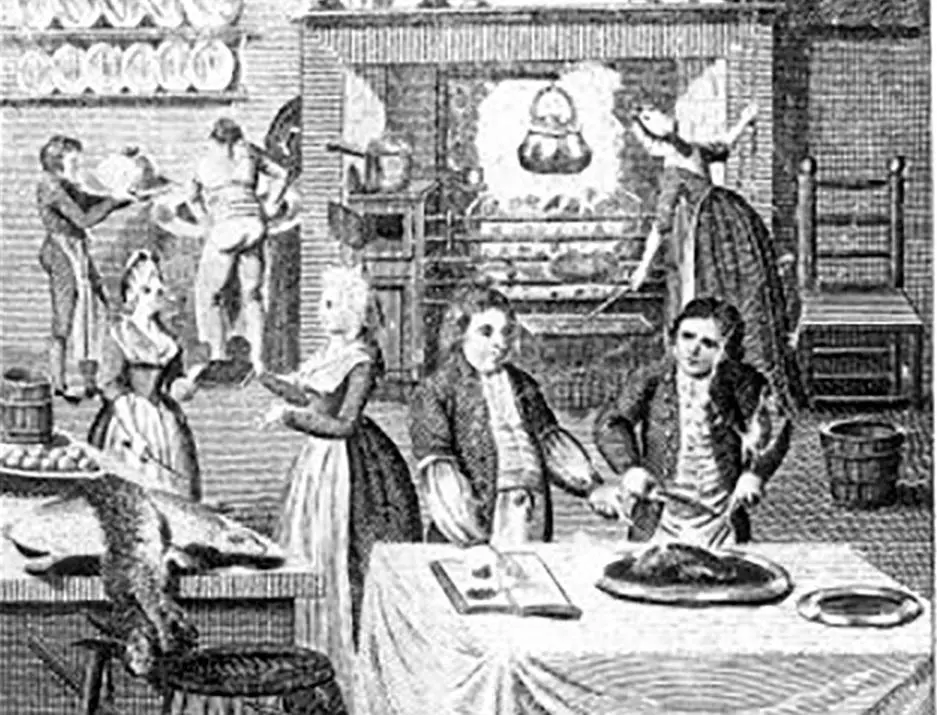 Kochen im Rokoko, Szene aus Küchentaschenbuch Leipzig, 1795